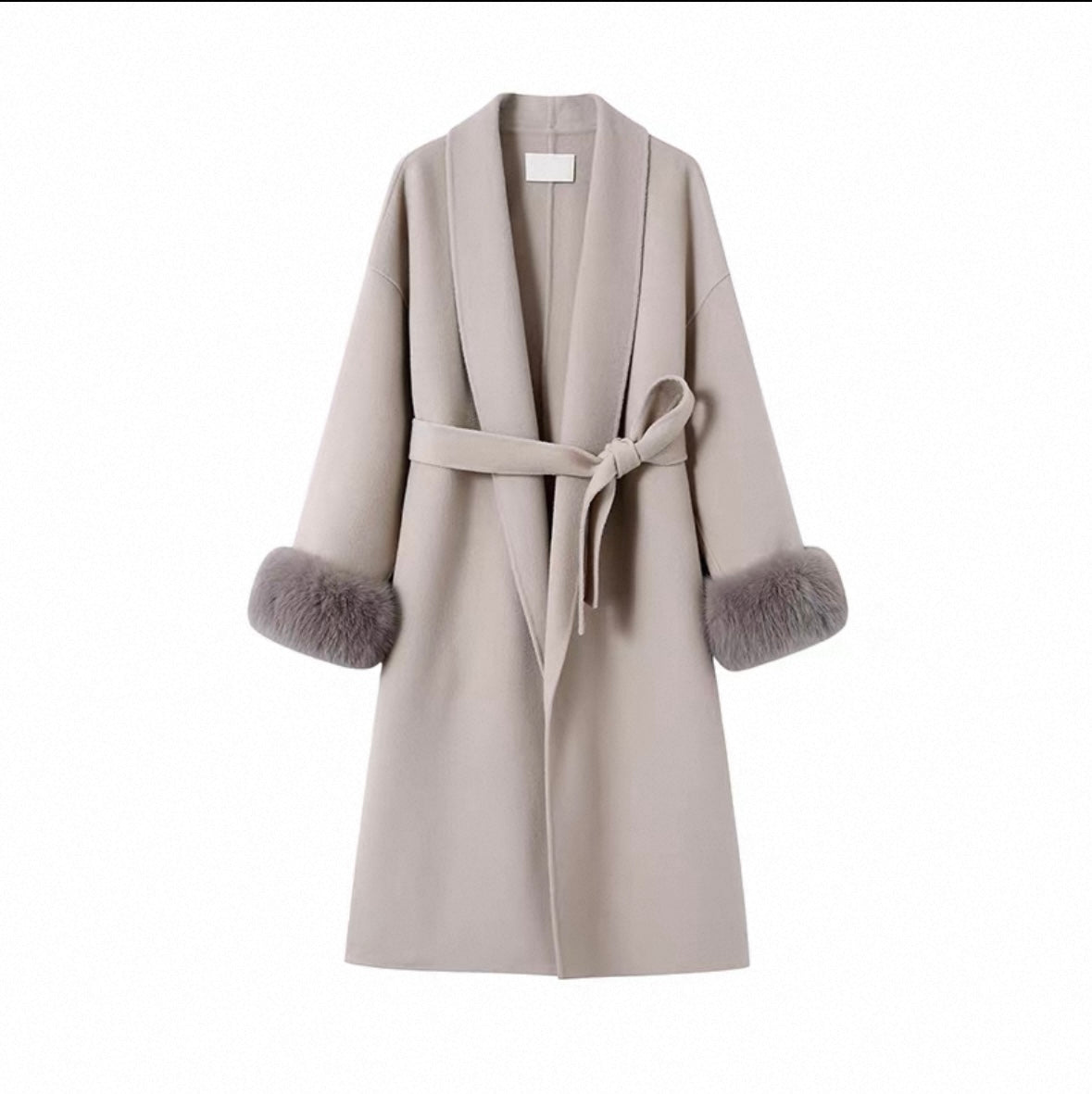 Der Mantel besteht aus einem hochwertigen Double-Face-Wollmix und besitzt einen luxuriösen, voluminösen Fuchspelz-Kragen, der sofort ins Auge sticht und deinem Outfit eine exklusive Note gibt.