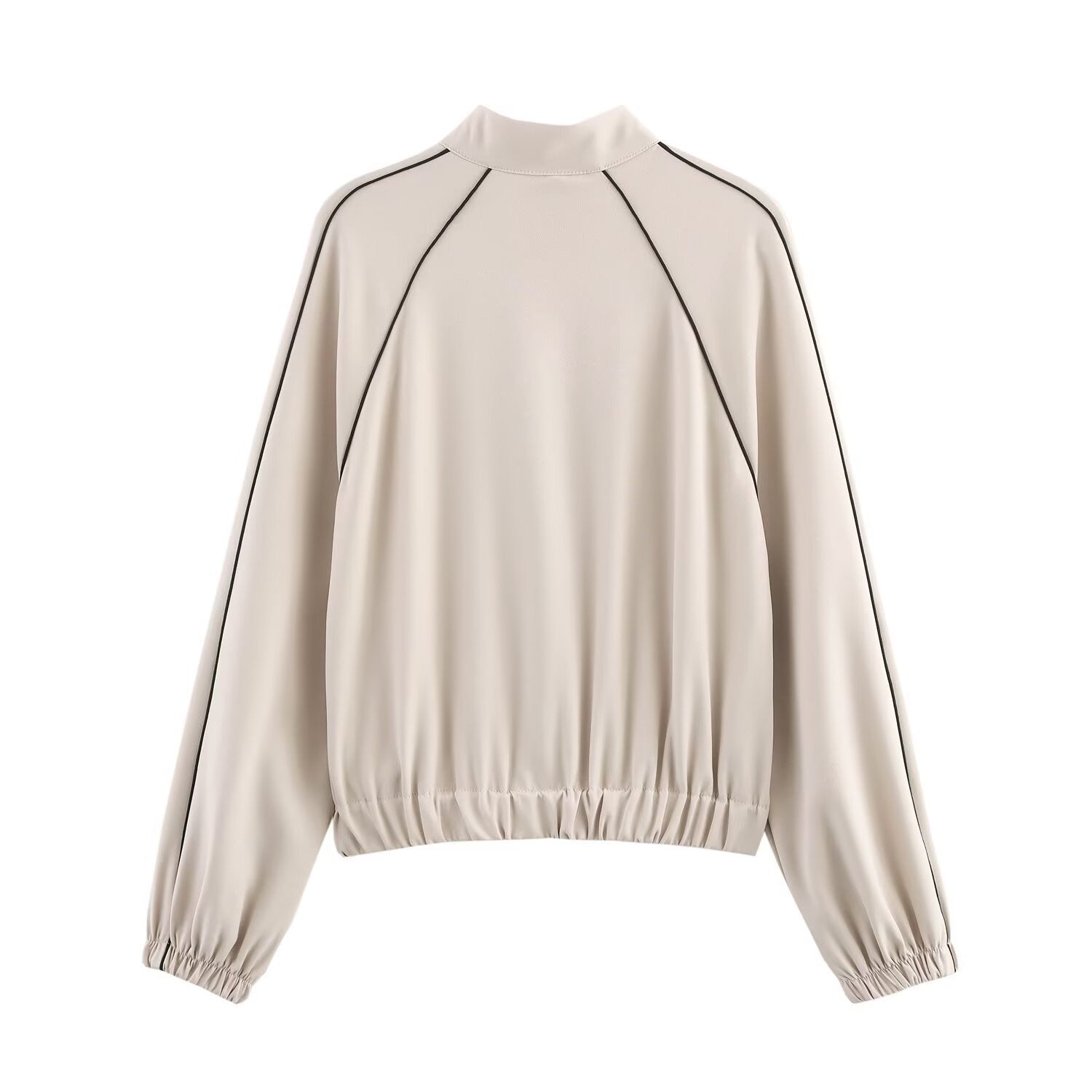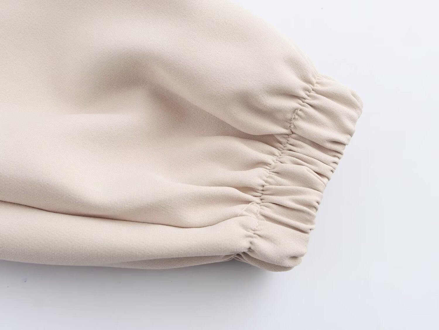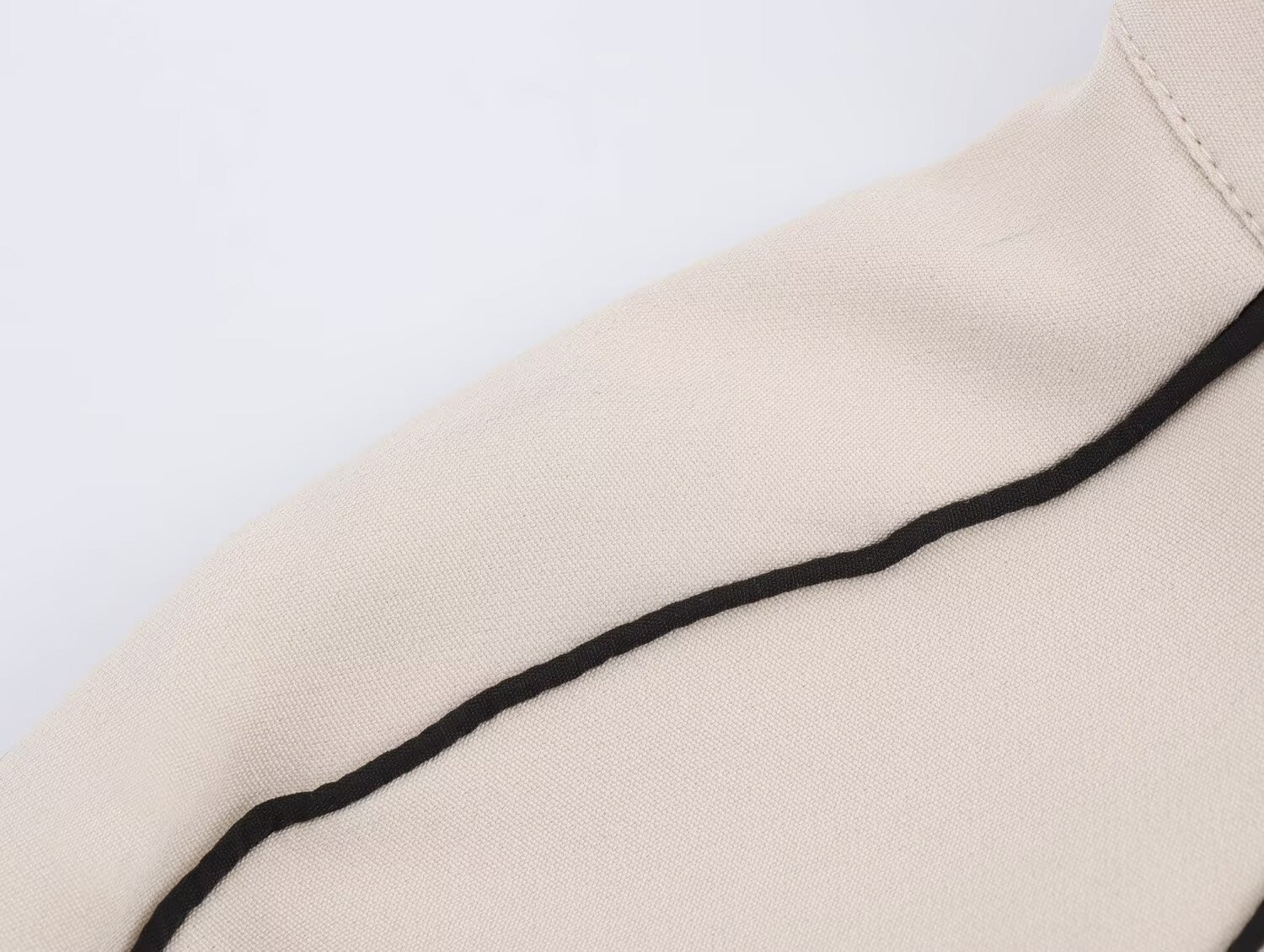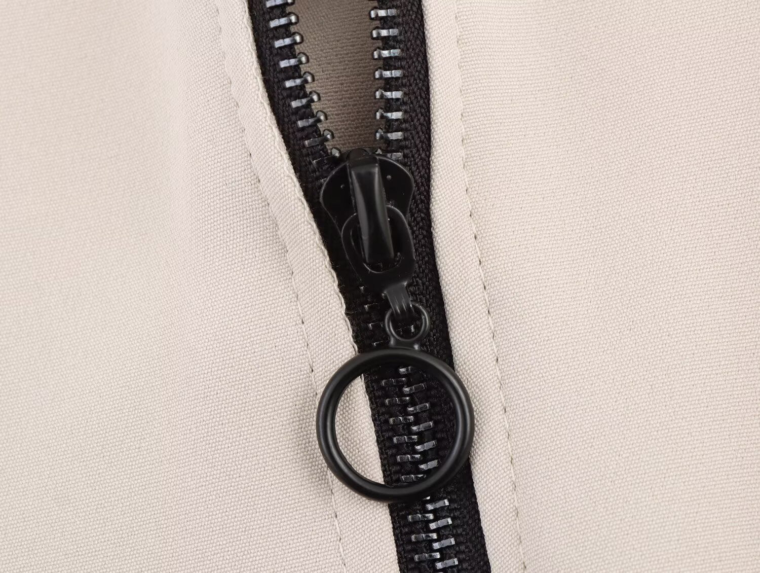 Minimalistisches und modernes Track Suit Set bestehend aus Jacke mit Reißverschluss und passender Hose. Das beige Design mit schwarzen Kontrastlinien verleiht dem Outfit einen cleanen, sportlichen Look. Durch den lockeren Schnitt und das leichte Material eignet sich das Set perfekt für Alltag, Freizeit oder Streetwear-Styles.